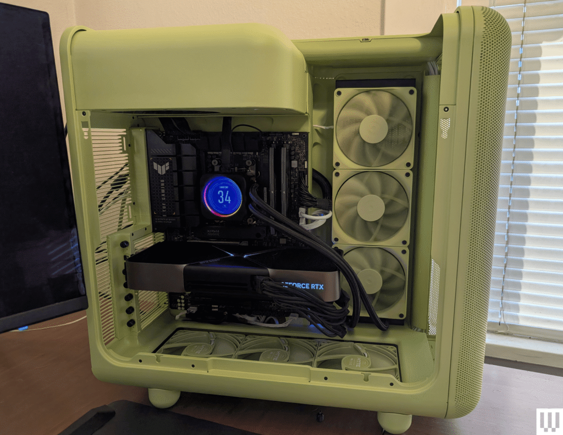 My old setup was running a fairly massive 360-mm AIO CPU cooler, which might be overkill, but it did raise an interesting predicament when moving into the X50. Ideally, the radiator would be mounted at the top of the case, so the pump in the CPU block is always filled with liquid, but with the PSU at the top, that’s not an option.