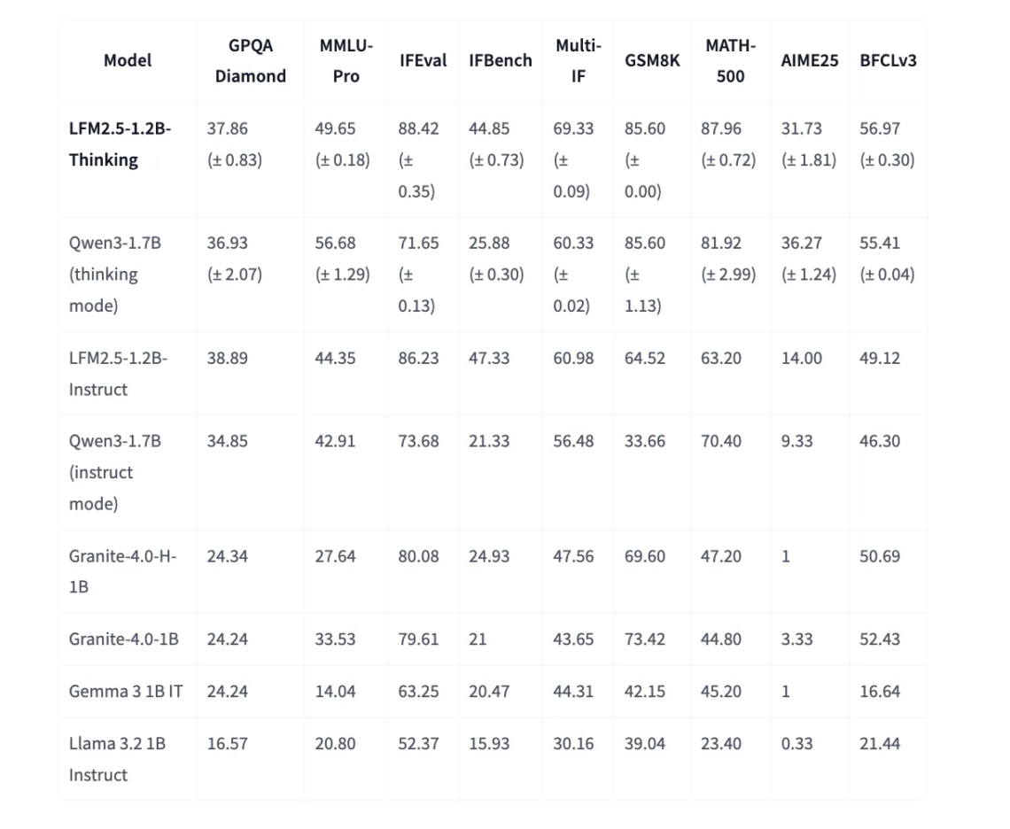 LFM2.5-1.2B-Thinking competes with Qwen3-1.7B in thinking mode on most reasoning benchmarks while using around 40 percent fewer parameters and fewer output tokens on average. It also outperforms other 1B class baselines such as Granite-4.0-H-1B, Granite-4.0-1B, Gemma-3-1B-IT, and Llama-3.2-1B Instruct on many of these tasks.
