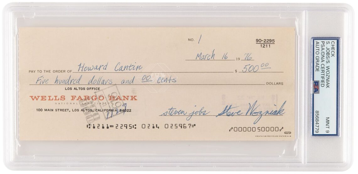 Items relating to early Apple history, especially items that involve Jobs, have gone to stratospheric prices in recent years. Jobs was famously reluctant to sign items, and his signature is regarded as among the most valuable of any public figure. Even a signed business card can go for as much as six figures. “There’s an emotional connection between Steve Jobs and collectors,” says RR’s executive vice president, Bobby Livingston. “People who start their own internet or engineering companies love Apple products.” Lonnie Mimms, the owner of check #2 and the founder of a tech museum in Roswell, Georgia, gushes about the value of such pieces of paper. “You can get anything in the world with a Steve Wozniak signature on it, but Jobs is another story. And the two of them together is the highest form of rarity.”