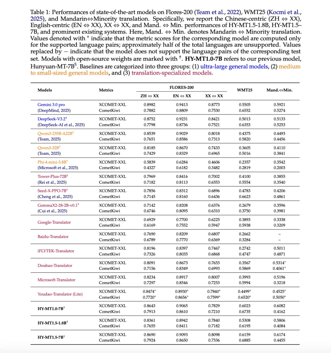 • HY-MT1.5-7B is an upgraded WMT25 champion system that reaches roughly 95 percent of Gemini 3.0 Pro on Flores 200 and surpasses it on WMT25 and Mandarin minority benchmarks, competing with much larger open and closed models.